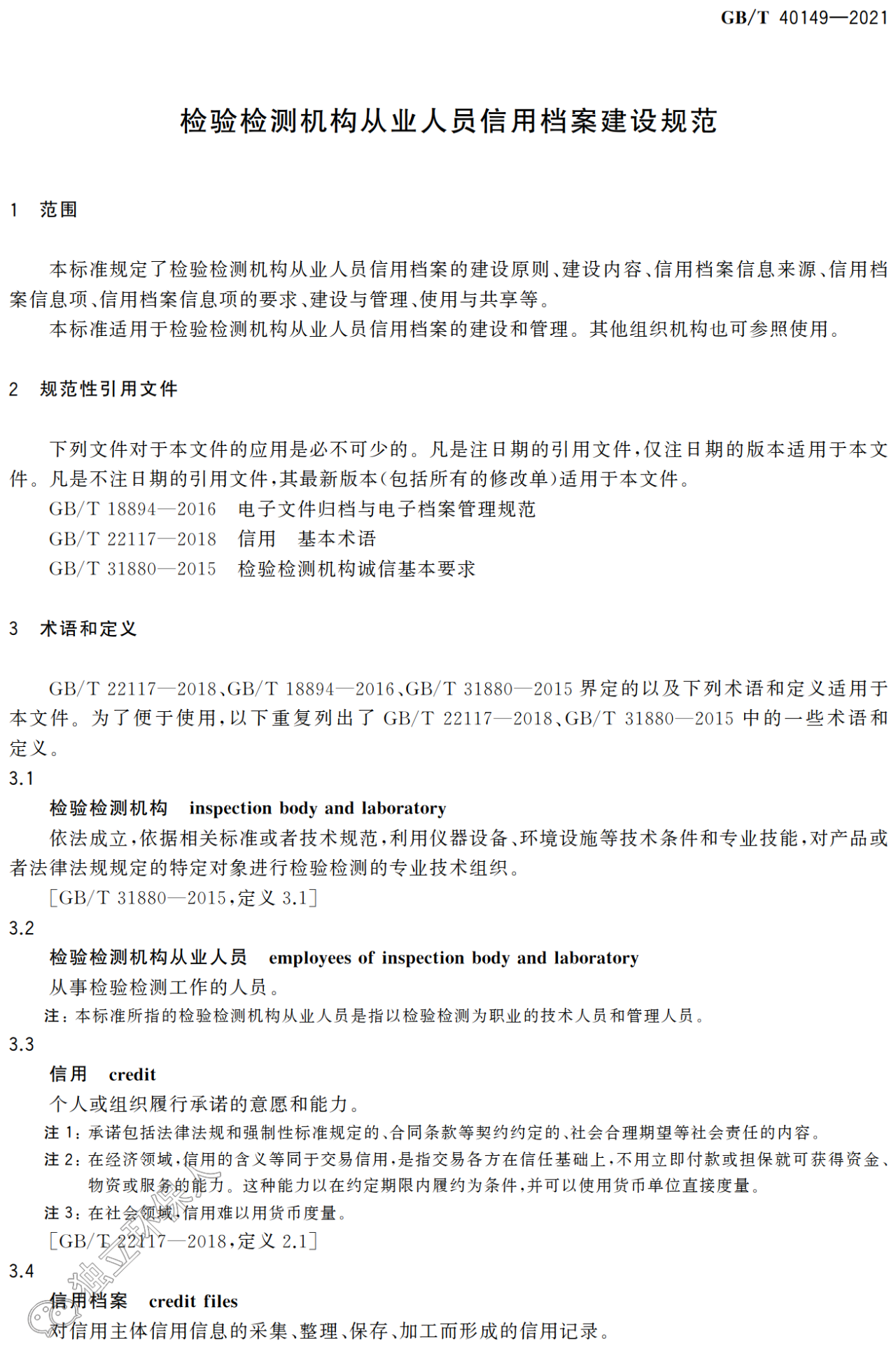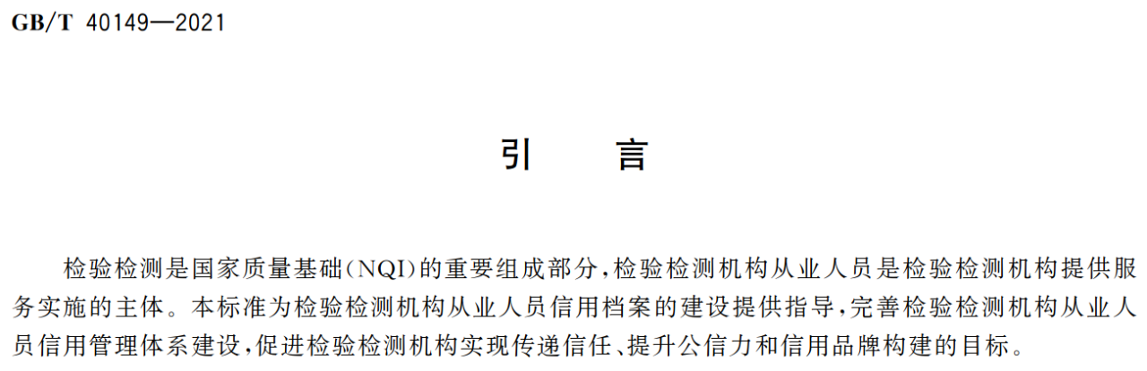 引言:檢驗(yàn)檢測(cè)是國(guó)家質(zhì)量基礎(chǔ)(NQI)的重要組成部分,檢驗(yàn)檢測(cè)機(jī)構(gòu)從業(yè)人員是檢驗(yàn)檢測(cè)機(jī)構(gòu)提供服務(wù)實(shí)施的主體。本標(biāo)準(zhǔn)為檢驗(yàn)檢測(cè)機(jī)構(gòu)從業(yè)人員信用檔案的建設(shè)提供指導(dǎo),完善檢驗(yàn)檢測(cè)機(jī)構(gòu)從業(yè)人員信用管理體系建設(shè),促進(jìn)檢驗(yàn)檢測(cè)機(jī)構(gòu)實(shí)現(xiàn)傳遞信任、提升公信力和信用品牌構(gòu)建的目標(biāo)。