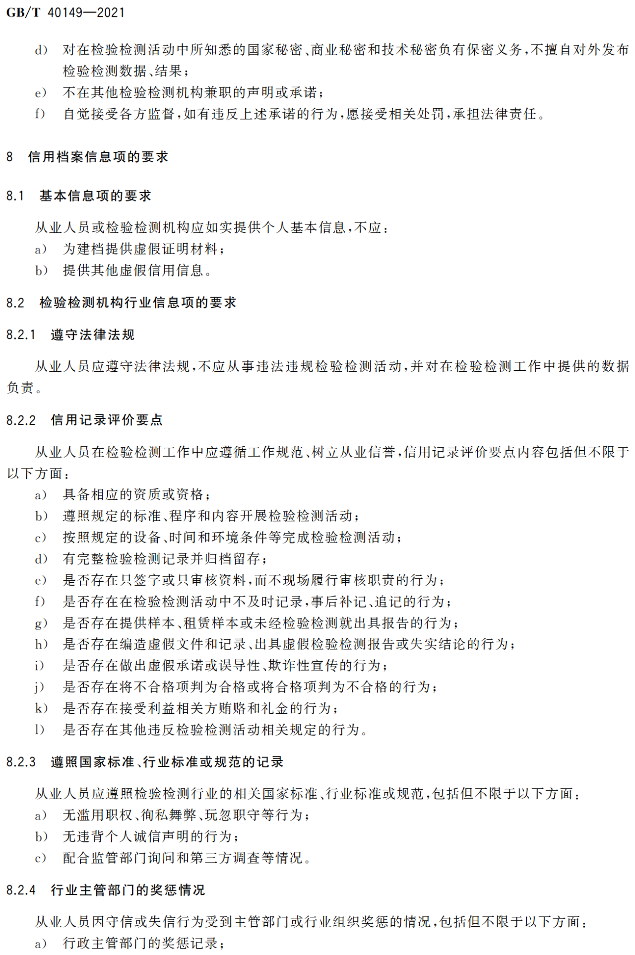實(shí)施時(shí)間:GB/T 40149-2021《檢驗(yàn)檢測(cè)機(jī)構(gòu)從業(yè)人員信用檔案建設(shè)規(guī)范》于2021年5月21日經(jīng)國(guó)家市場(chǎng)監(jiān)督管理總局(國(guó)家標(biāo)準(zhǔn)化管理委員會(huì))批準(zhǔn)發(fā)布,自2021年12月1日起實(shí)施。