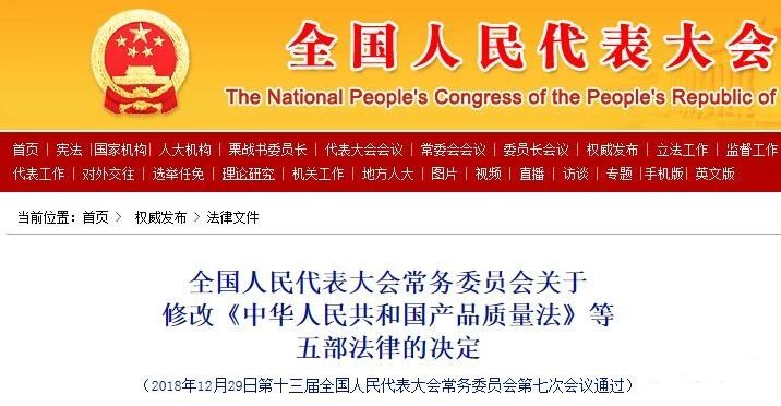 2018年12月29日,中華人民共和國第十三屆全國人民代表大會常務(wù)委員會第七次會議通過了《全國人民代表大會常務(wù)委員會關(guān)于修改<中華人民共和國產(chǎn)品質(zhì)量法>等五部法律的決定》(中華人民共和國主席令第二十二號),下文簡稱《決定》。《決定》自公布之日起施行。