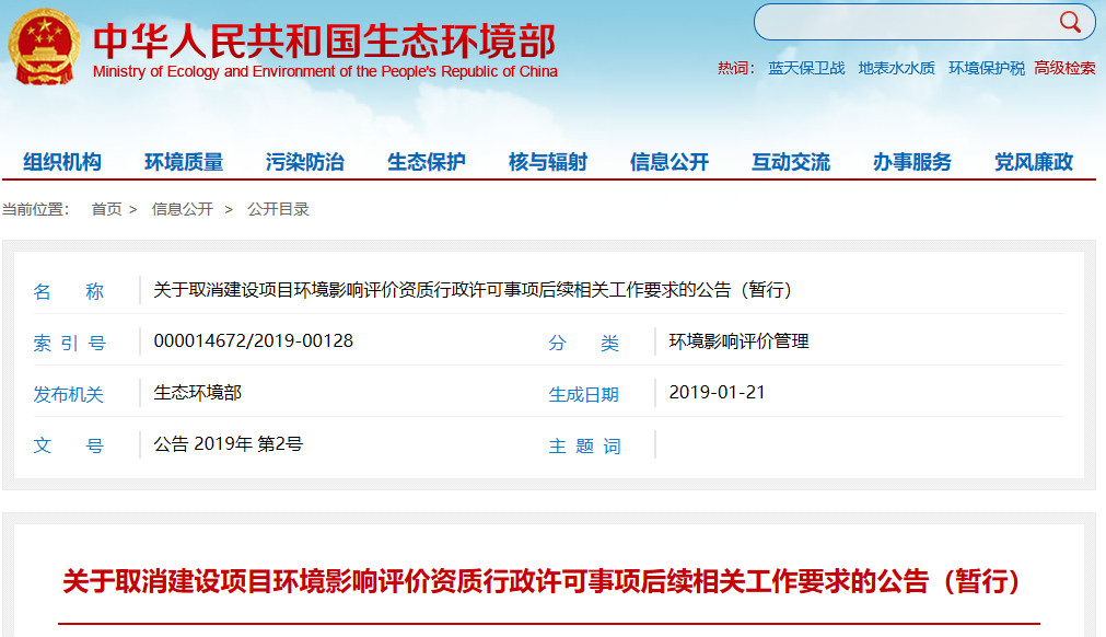 一、自本公告發(fā)布之日起,《建設(shè)項(xiàng)目環(huán)境影響評(píng)價(jià)資質(zhì)管理辦法》(環(huán)境保護(hù)部令第36號(hào),以下簡稱36號(hào)令)停止執(zhí)行;《關(guān)于發(fā)布〈建設(shè)項(xiàng)目環(huán)境影響評(píng)價(jià)資質(zhì)管理辦法〉配套文件的公告》(環(huán)境保護(hù)部公告2015年第67號(hào))即行廢止。自2018年12月29日起,我部已不再受理建設(shè)項(xiàng)目環(huán)境影響評(píng)價(jià)資質(zhì)申請(qǐng),已受理但尚未完成審查的申請(qǐng)事項(xiàng)不再繼續(xù)審查;我部環(huán)境影響評(píng)價(jià)工程師從業(yè)情況信息管理系統(tǒng)已不再接收申報(bào)材料,已接收申報(bào)材料但尚未核發(fā)登記編號(hào)的,不再核發(fā)。