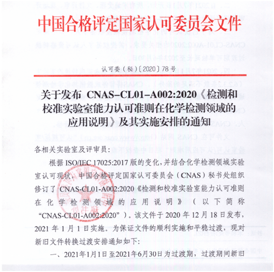 1、     CNAS-CL01-A002:2020《檢測(cè)和校準(zhǔn)實(shí)驗(yàn)室能力認(rèn)可準(zhǔn)則在化學(xué)檢測(cè)領(lǐng)域的應(yīng)用說明》;