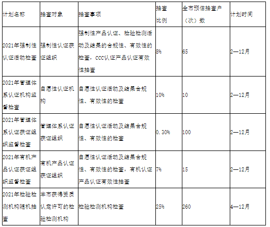 近日,上海市場監(jiān)管局制定發(fā)布了《2021年“雙隨機(jī)、一公開”抽查計(jì)劃》。上海市場監(jiān)管部門全年預(yù)估抽查各類市場主體14.3萬戶(次),抽檢食品5.2萬批次、生產(chǎn)領(lǐng)域產(chǎn)品1200批次。抽查領(lǐng)域涵蓋企業(yè)年度報(bào)告、食品安全、產(chǎn)品質(zhì)量、特種設(shè)備、網(wǎng)絡(luò)交易、知識(shí)產(chǎn)權(quán)、計(jì)量、標(biāo)準(zhǔn)、認(rèn)證認(rèn)可、廣告、物價(jià)檢查等,隨機(jī)抽查比例分別為0.3%~100%不等。 上海市《2021年“雙隨機(jī)、一公開”抽查計(jì)劃》涉及認(rèn)證、檢測相關(guān)抽查計(jì)劃如下: