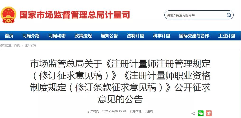 市場監(jiān)管總局關(guān)于《注冊計量師注冊管理規(guī)定(修訂征求意見稿)》《注冊計量師職業(yè)資格制度規(guī)定(修訂條款征求意見稿)》公開征求意見的公告